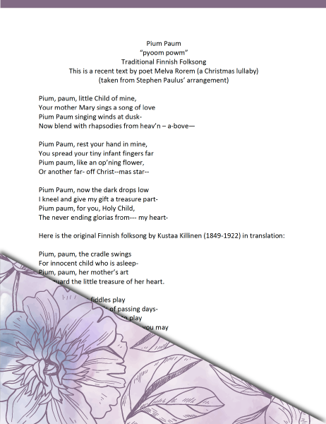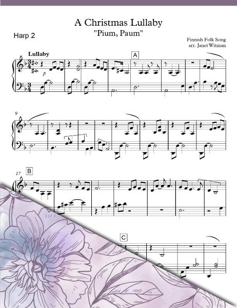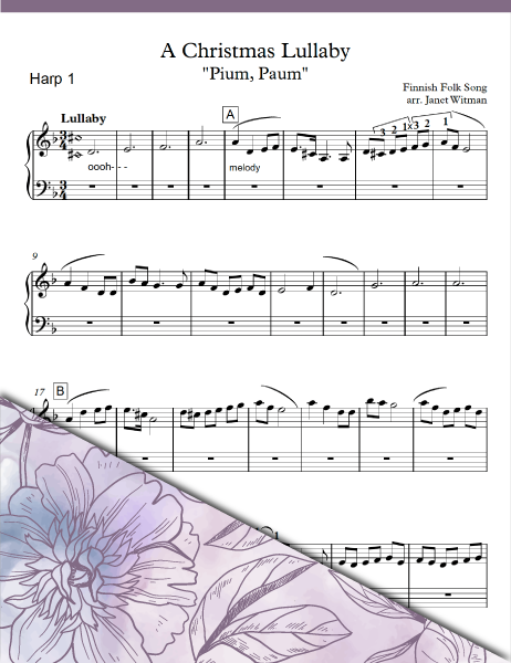This haunting traditional Finnish lullaby is presented as a Christmas lullaby but can be used anytime! Janet has provided the original Finnish folksong text and a newer version that could be sung at Christmas time. Enjoy listening to the youtube video of 15 harpers playing the piece, the Central NY AHS Chapter. Thank you!